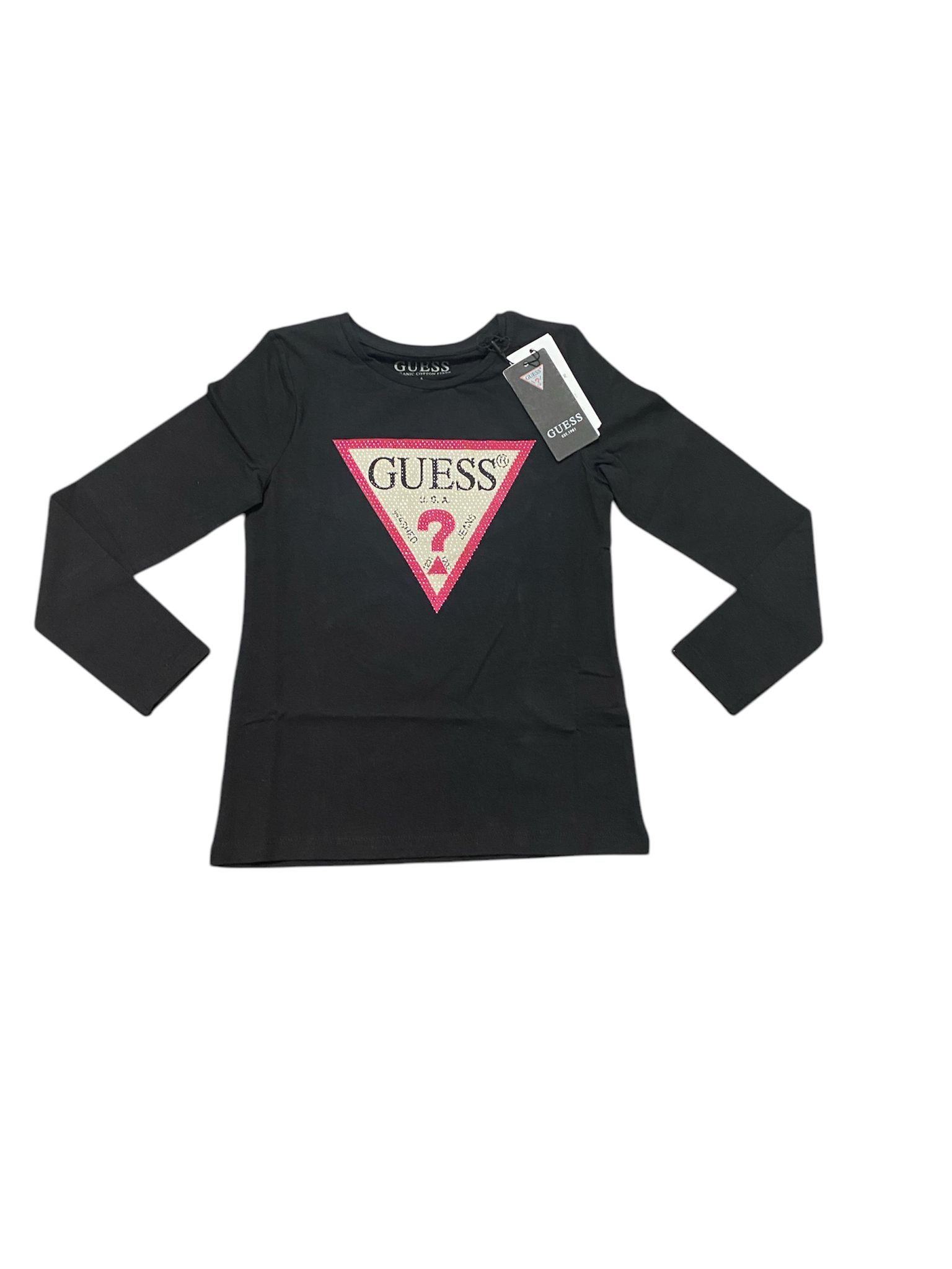 T-shirt a manica lunga Guess, di colore nero con stampa del classico triangolo GUESS ricoperstro di strass.
