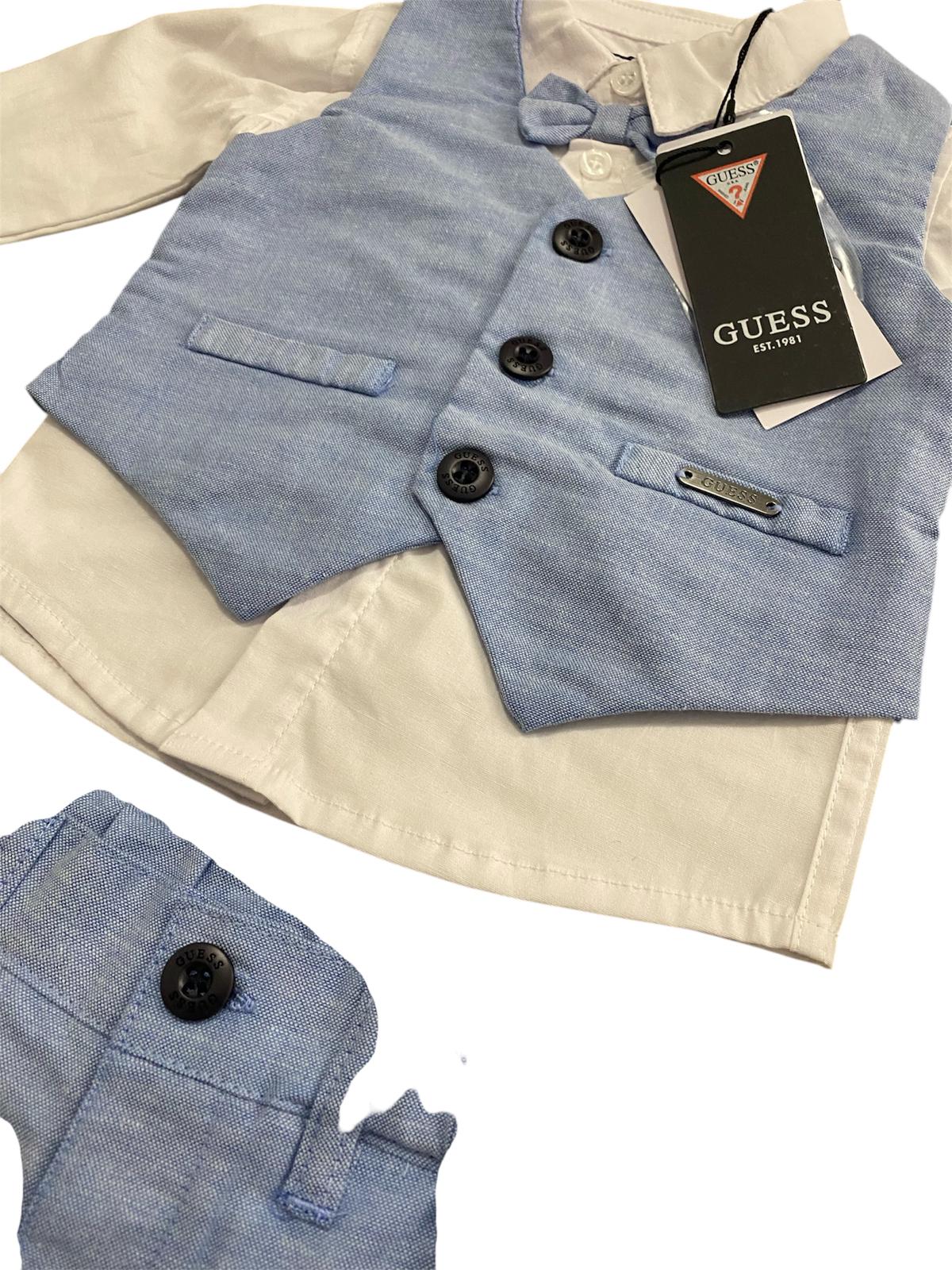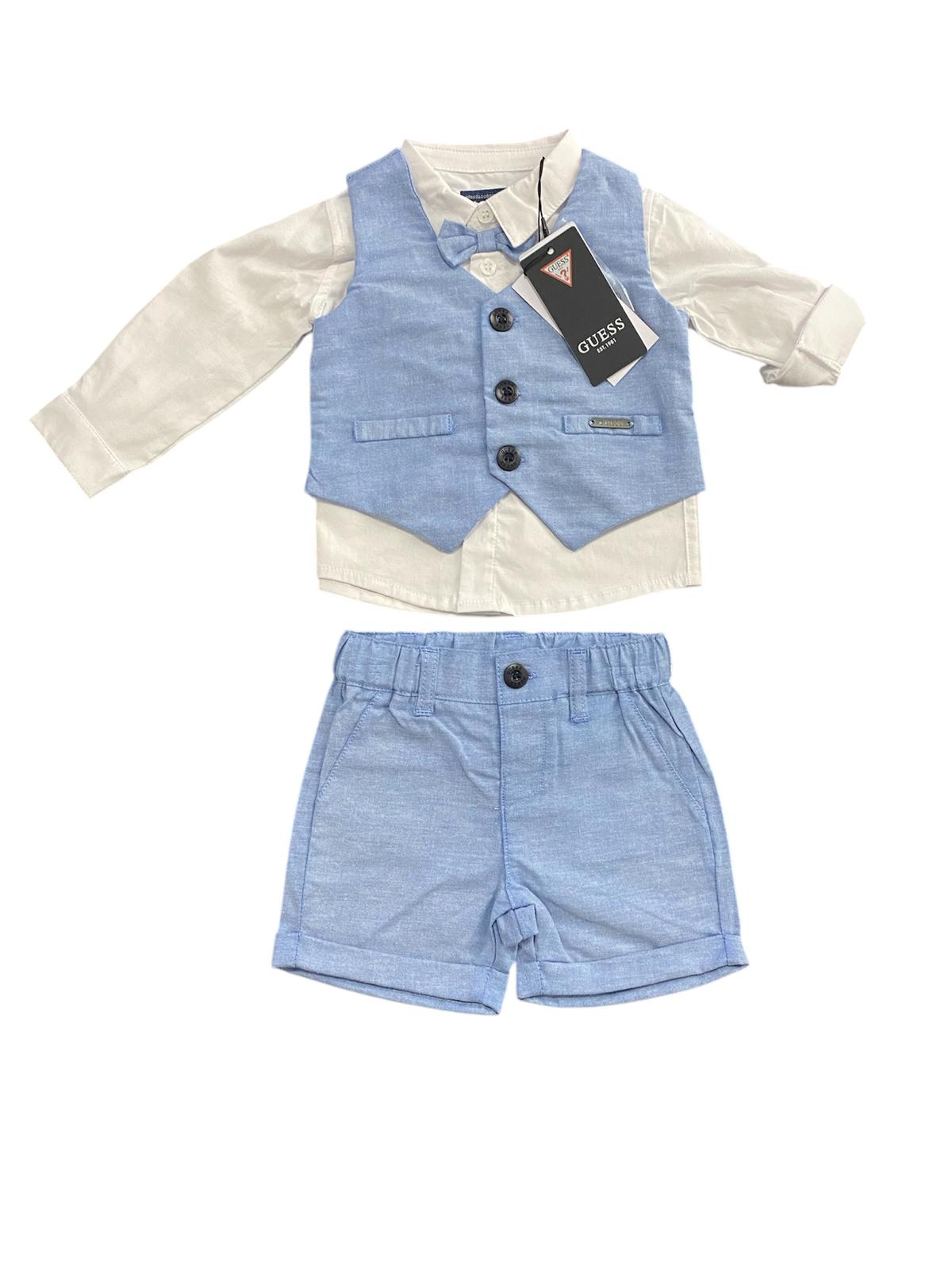 Completo cerimonia Guess, composto da pantaloncino e pagliaccetto azzurro e camicia bianca.