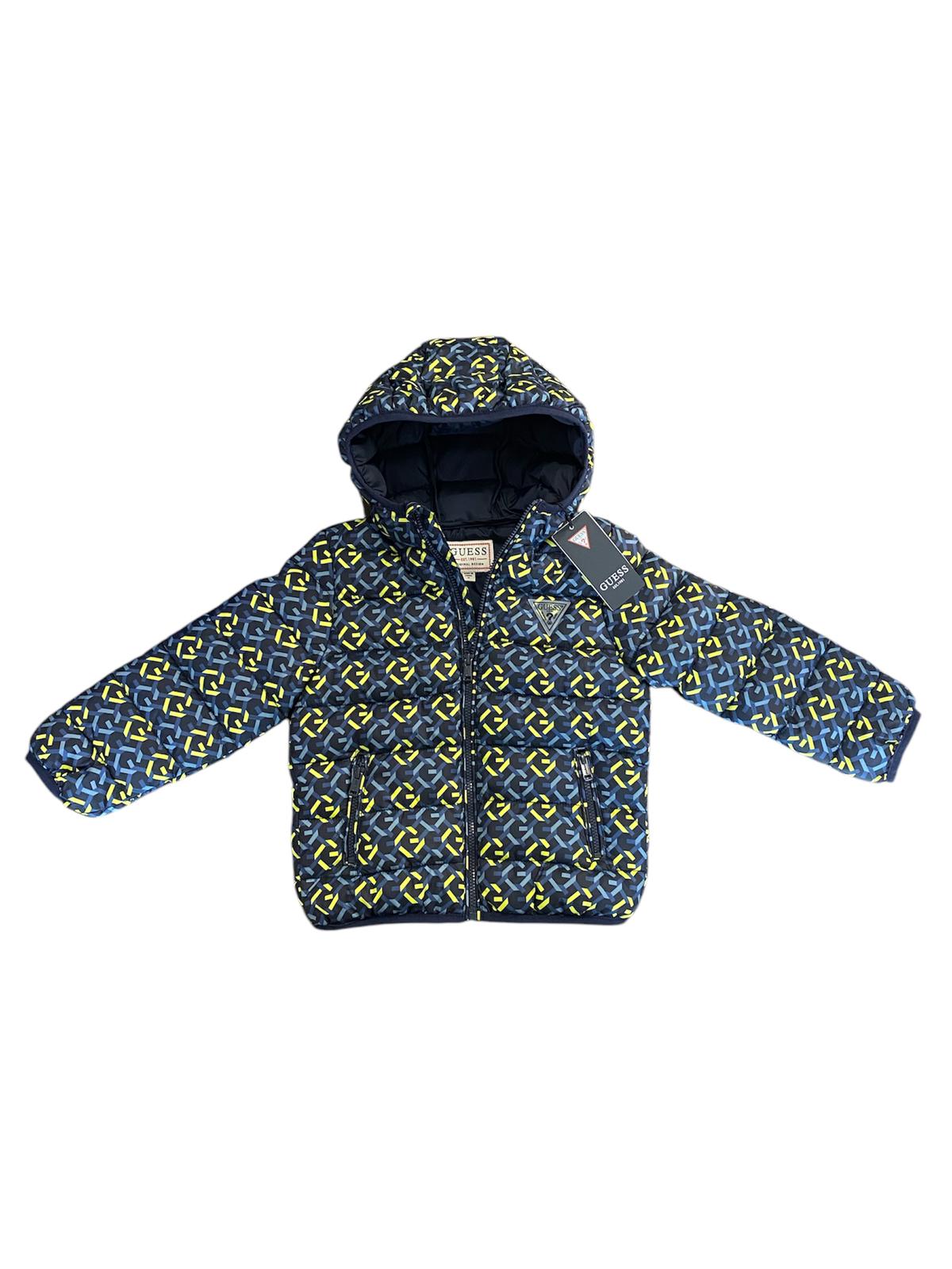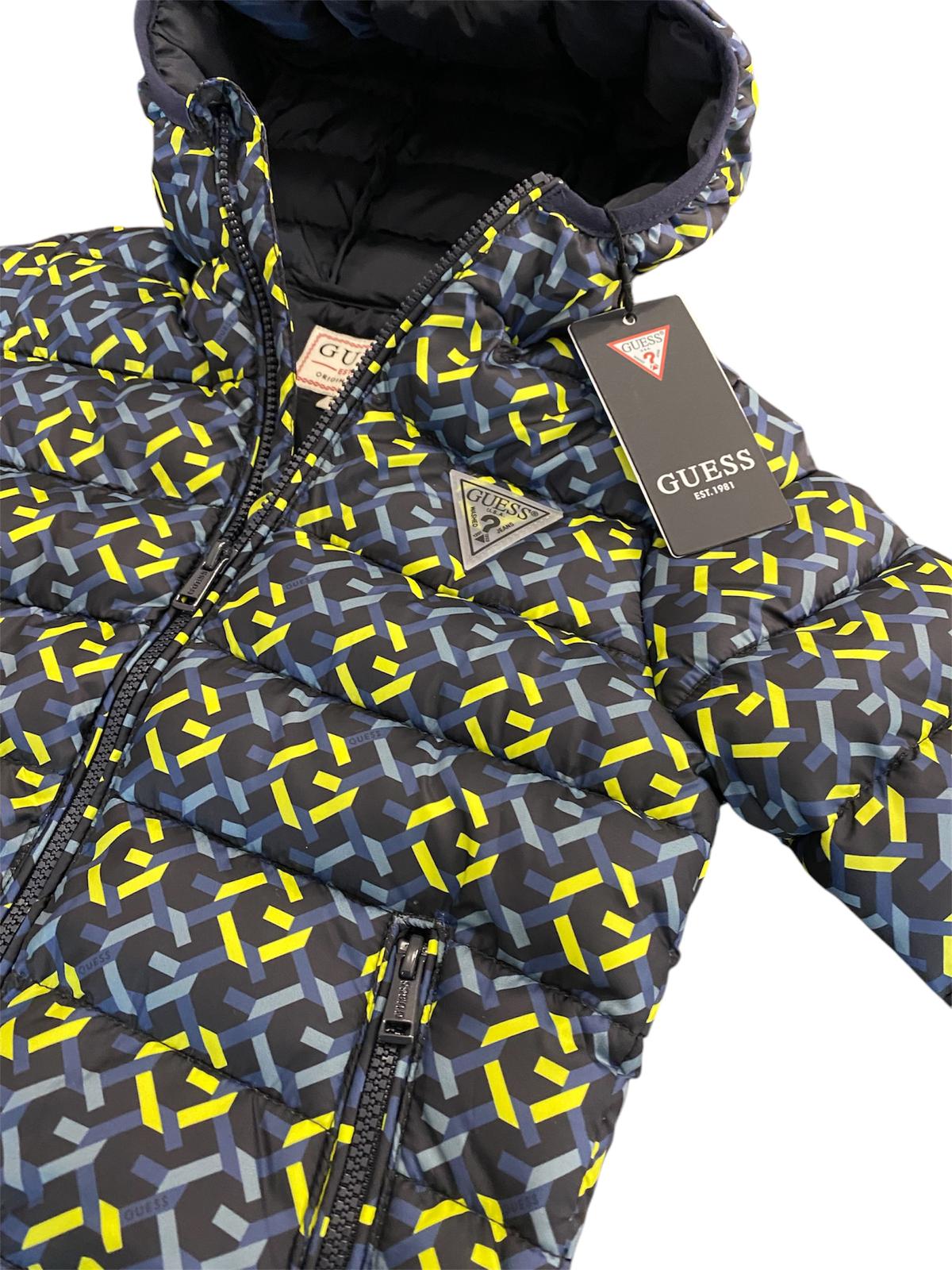 Giubbotto Guess, a fpndo nero in famtasia geometrica colorata, con cappuccio e chiusura a zip.