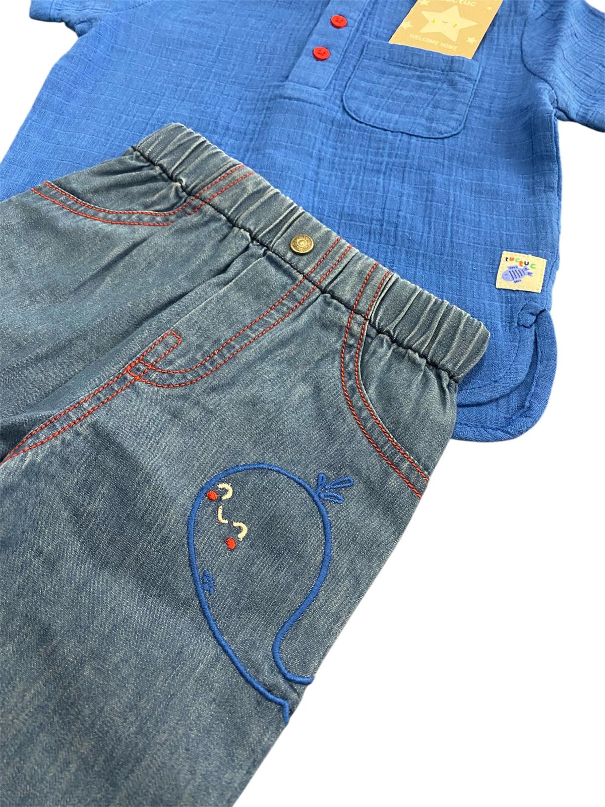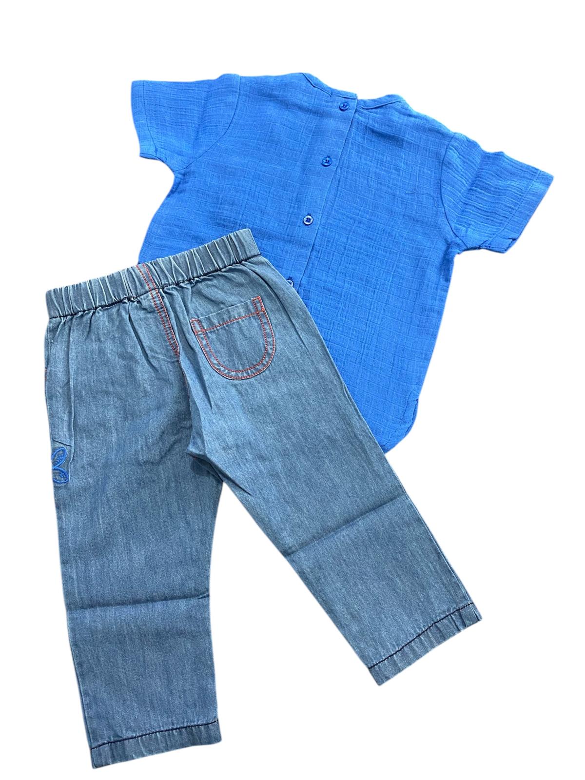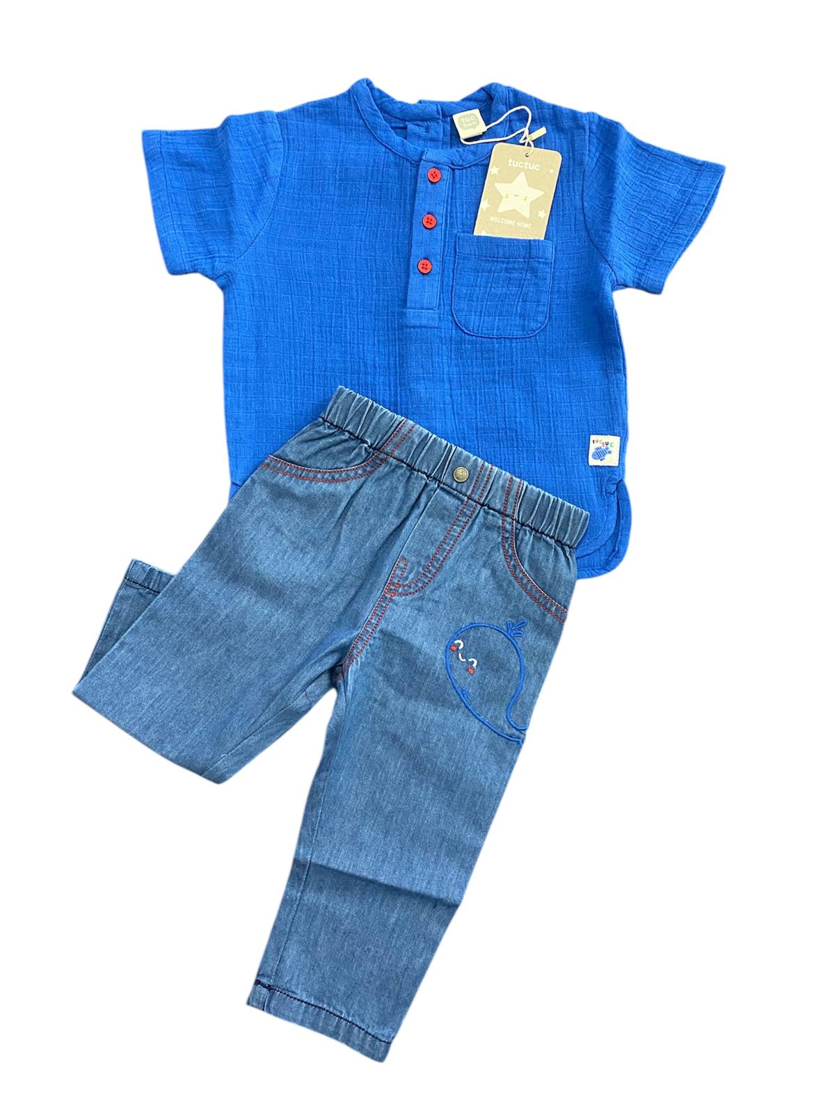 Completo Tuc Tuc, con t-shirt girocollo a 3 bottoni  e taschino di color bluette e jeans leggero  con elastico in vita e balena ricamata.