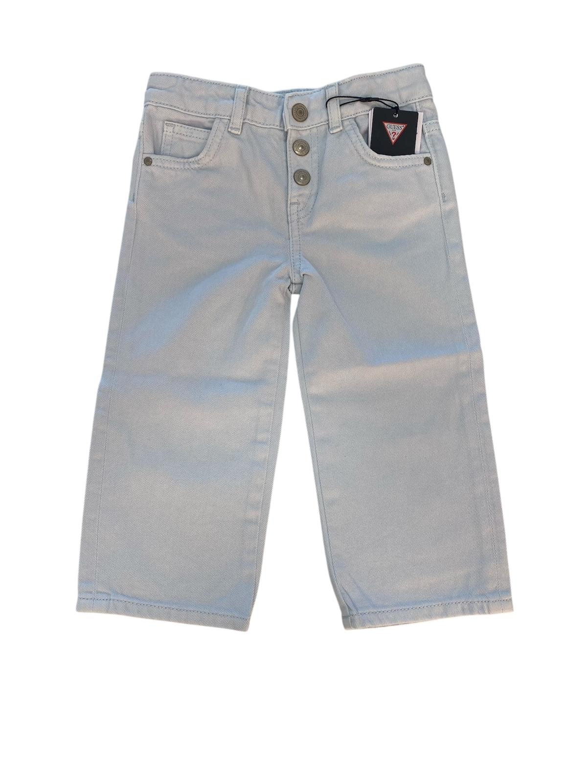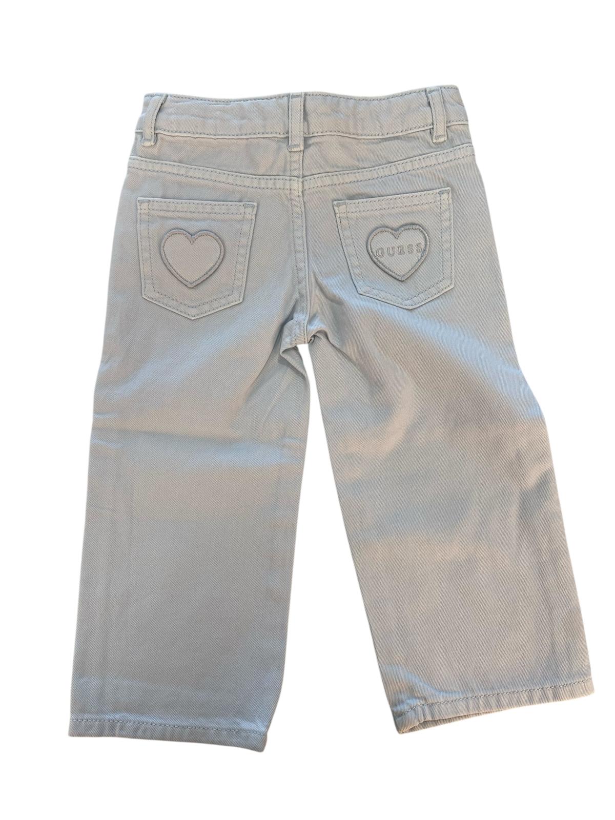 Jeans Guess a gamba larga, di colore azurro light e cuoricini nelle tasche posteriori.