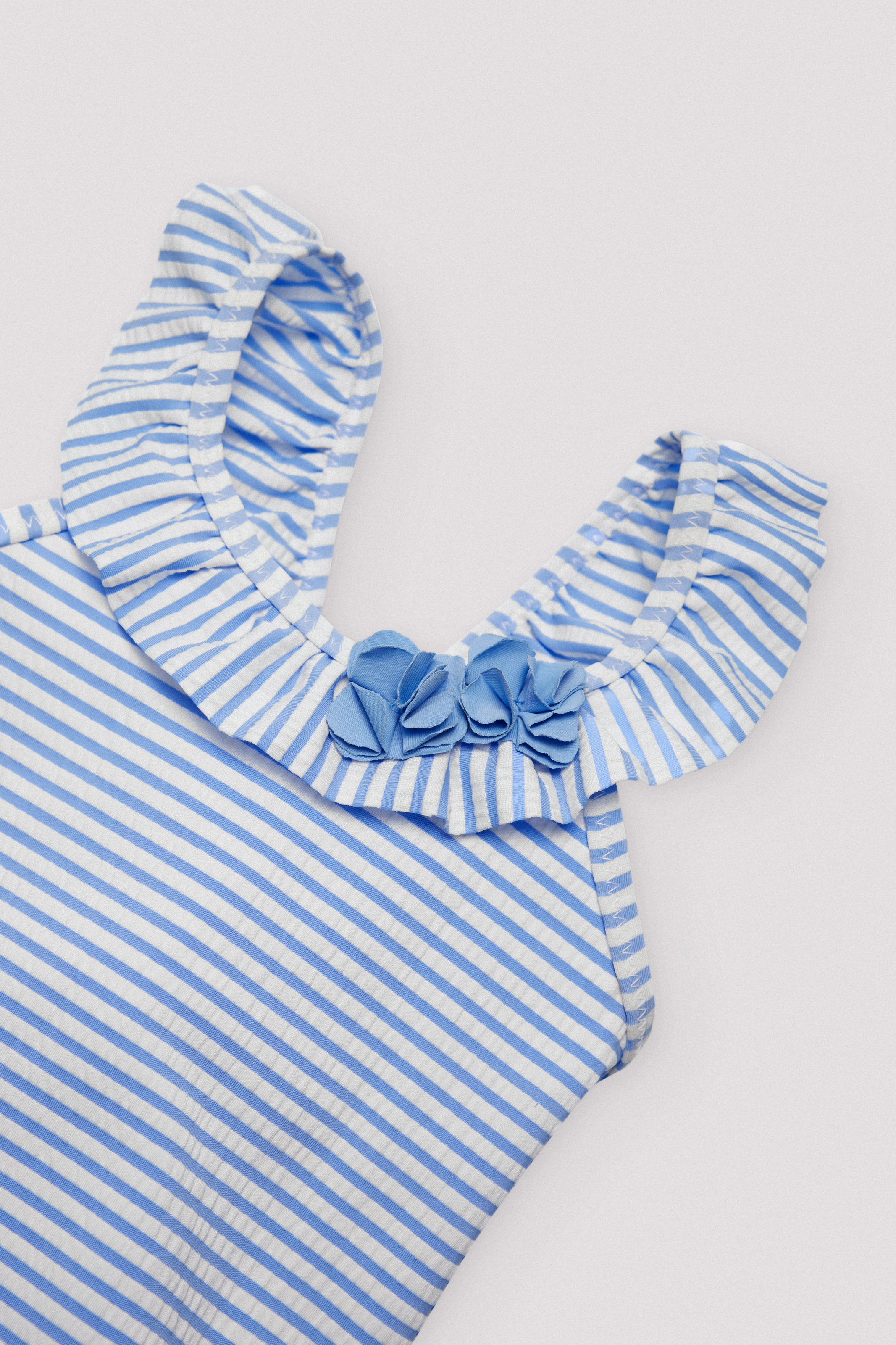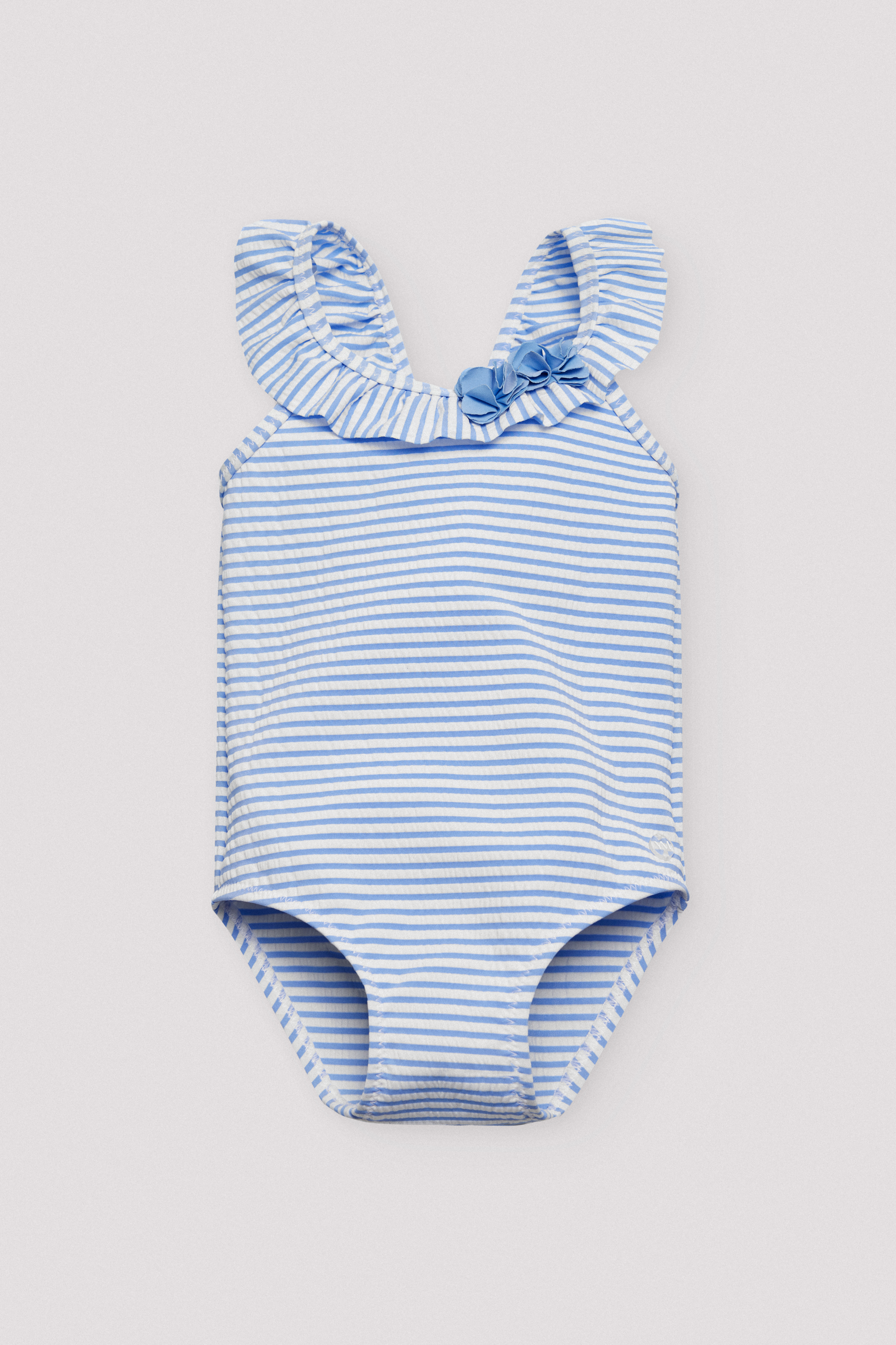 Costume intero Ysabel Mora, in fantasia a righe nei toni del bianco e azzurro, con rouge e applicazione nella parte sopra.