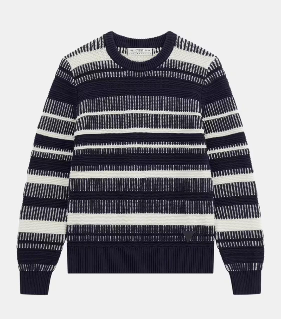 Maglione guess, nei toni del blu e bianco a girocollo e maniche con polsino, con motivo a righe.