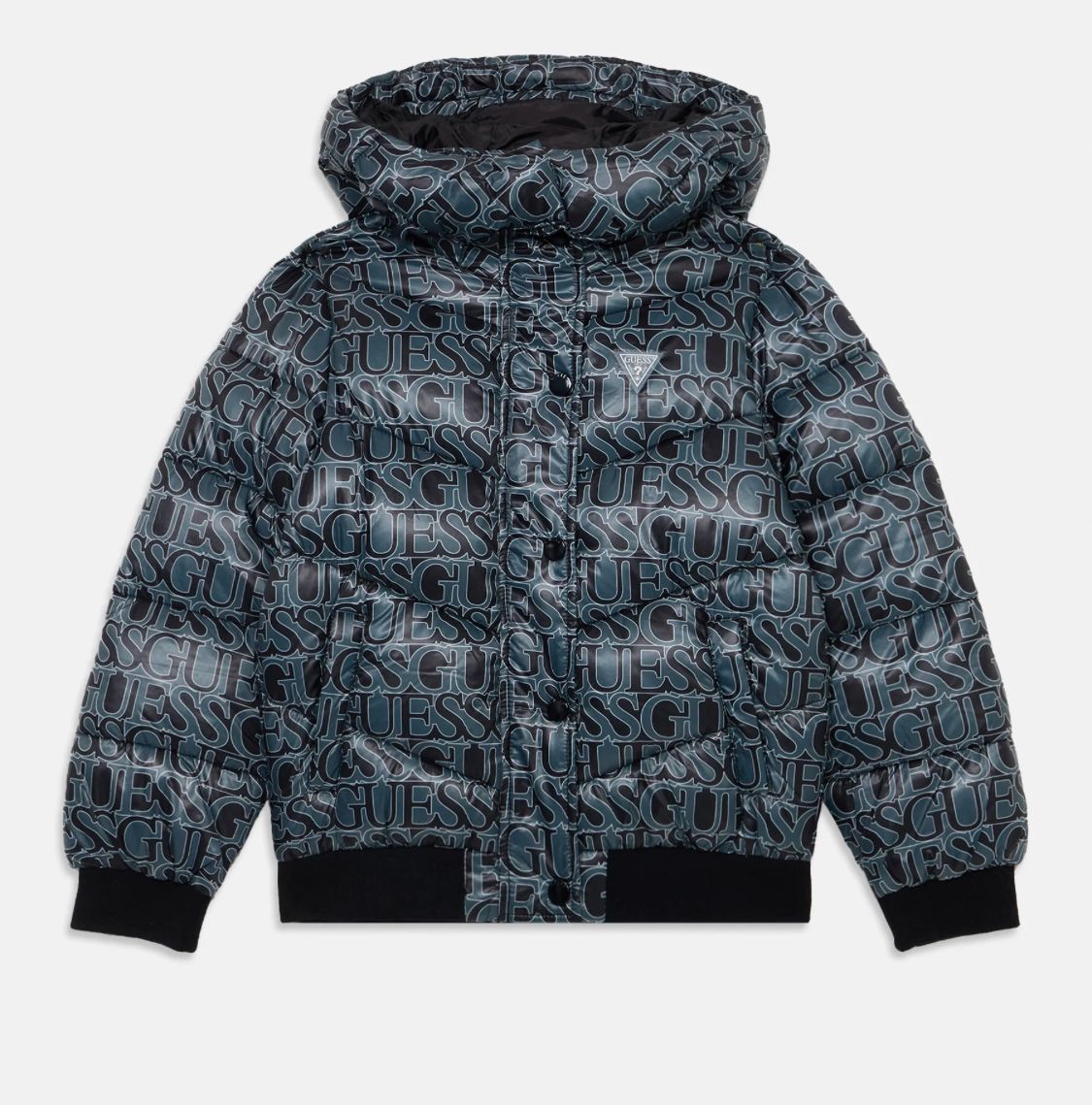 Giubbotto Guess di colore grigio/nero, con cappuccio removibilee fascione elastico.