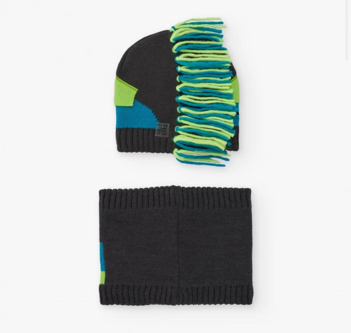 Berretteo e scalda collo invernale Tuc Tuc , coordinati in grigio scuro e righe blu e verdi.