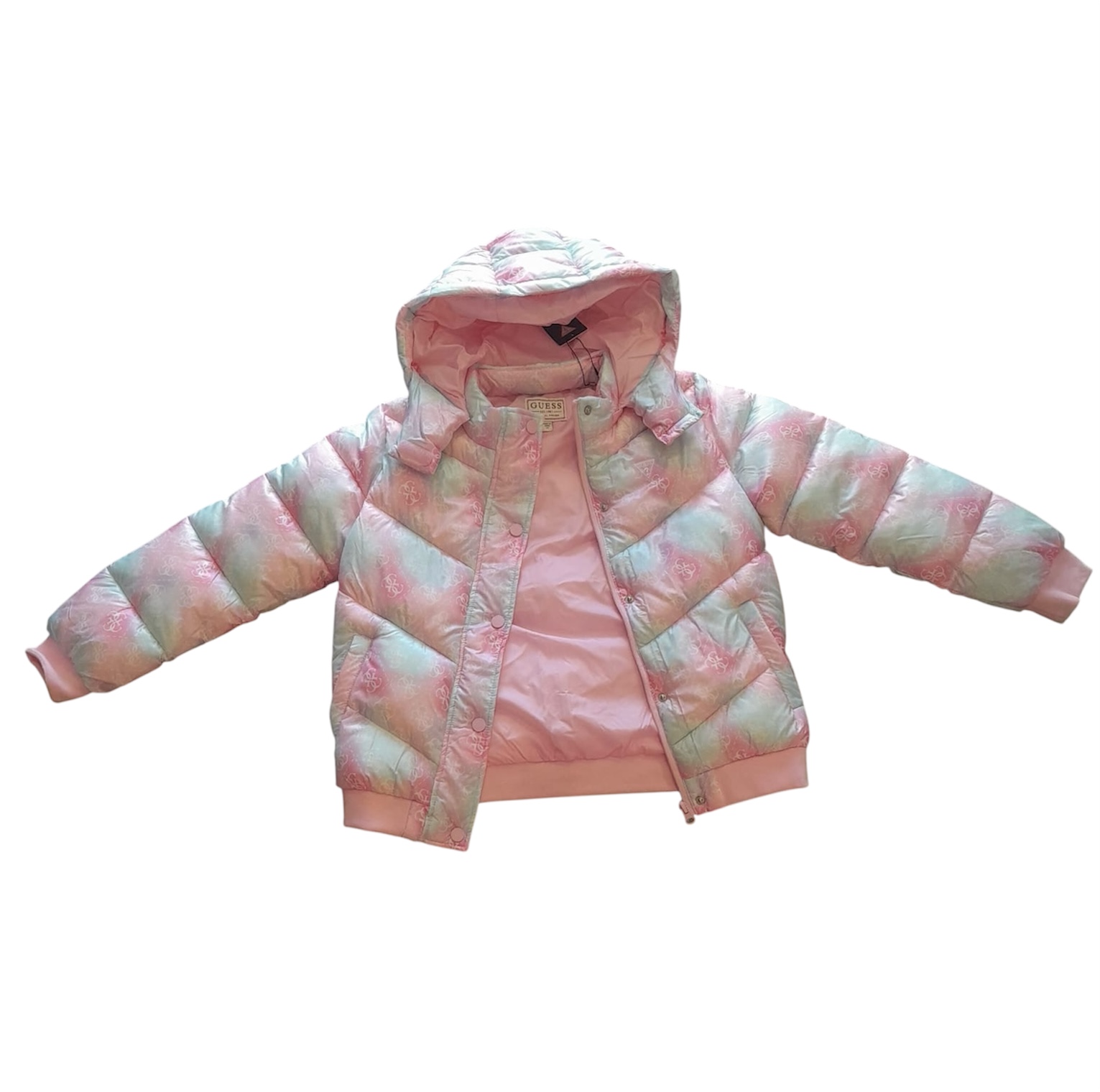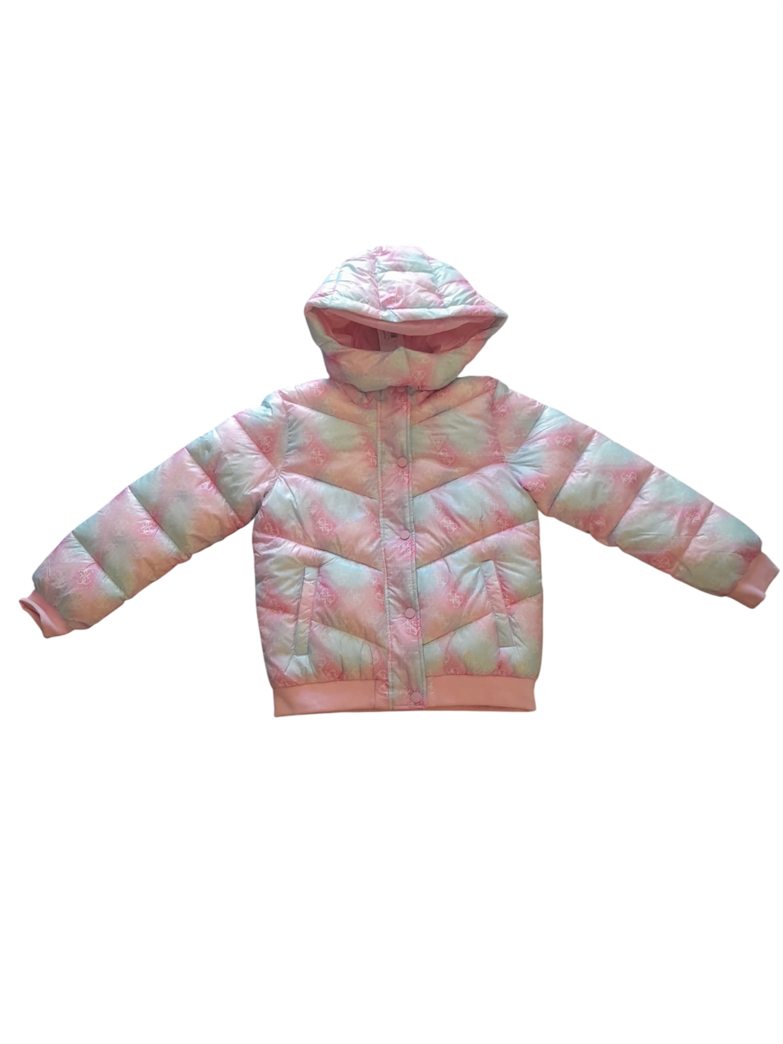 Giubbotto Guess multicolor, con motivo monogramma, dotato di cappuccio e fascio e in vita.