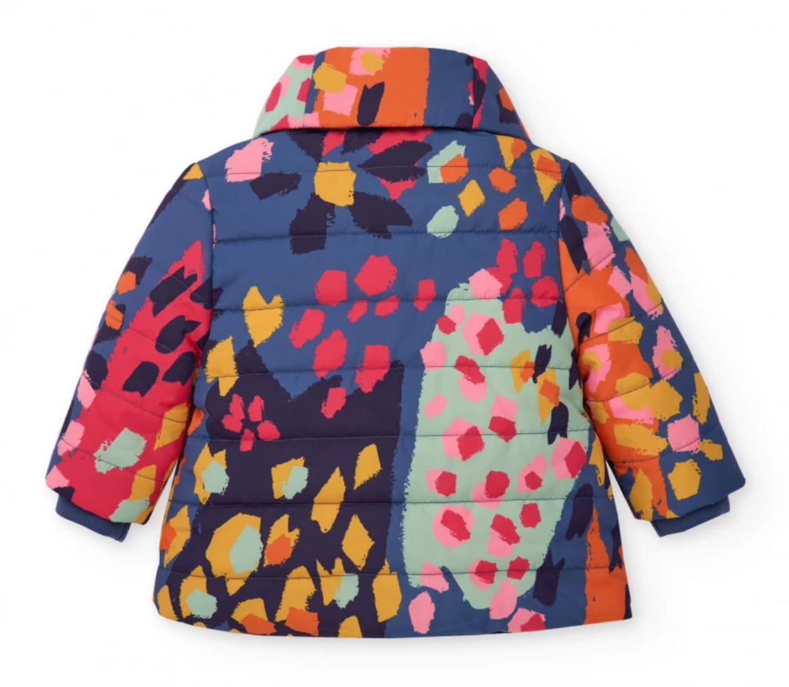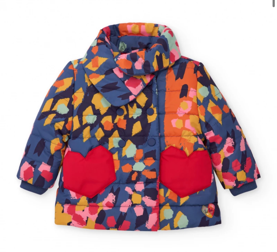 Cappotto imbottito TUC TUC per bambina con stampa a macchie multicolore e tasche a forma di cuore rosso.