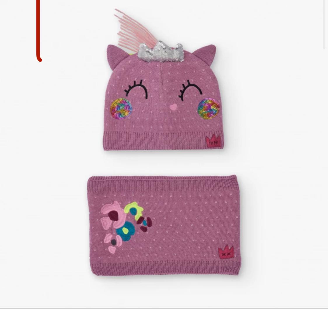 Berretto e scaldacollo invernale Tuc Tuc color malva, berretto con motivo a unicorno con orecchie e corona di paillettes.